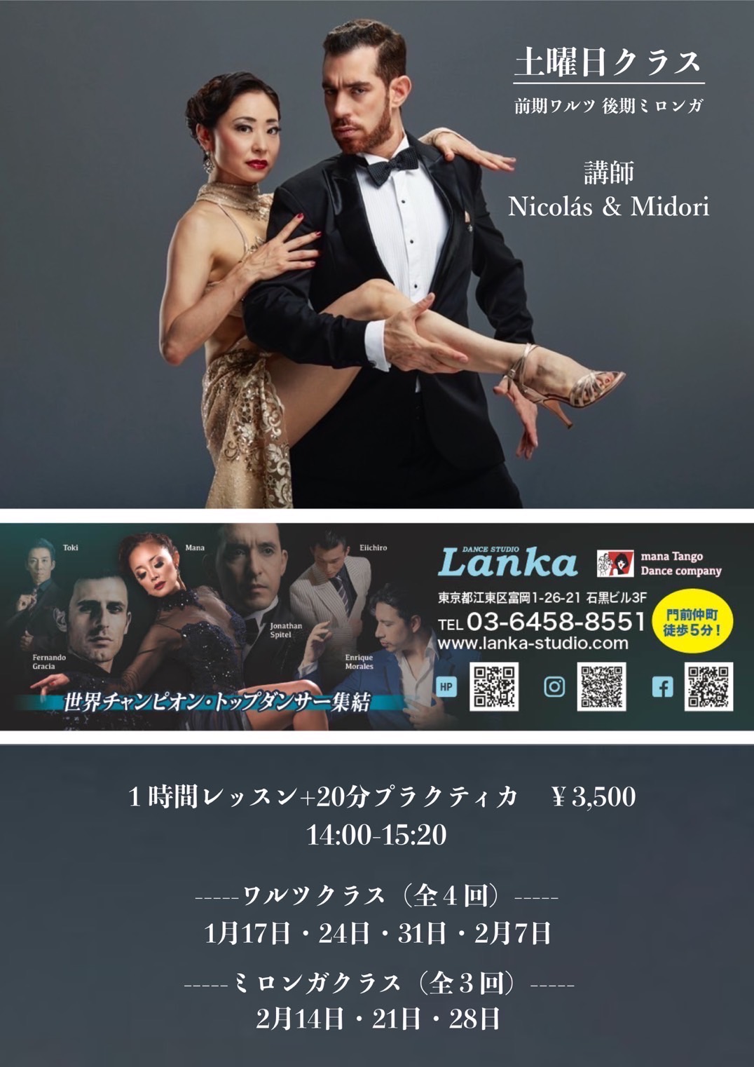 【土曜日クラス】前期:ワルツ/後期:ミロンガ(Nicolas&Midori)のご案内