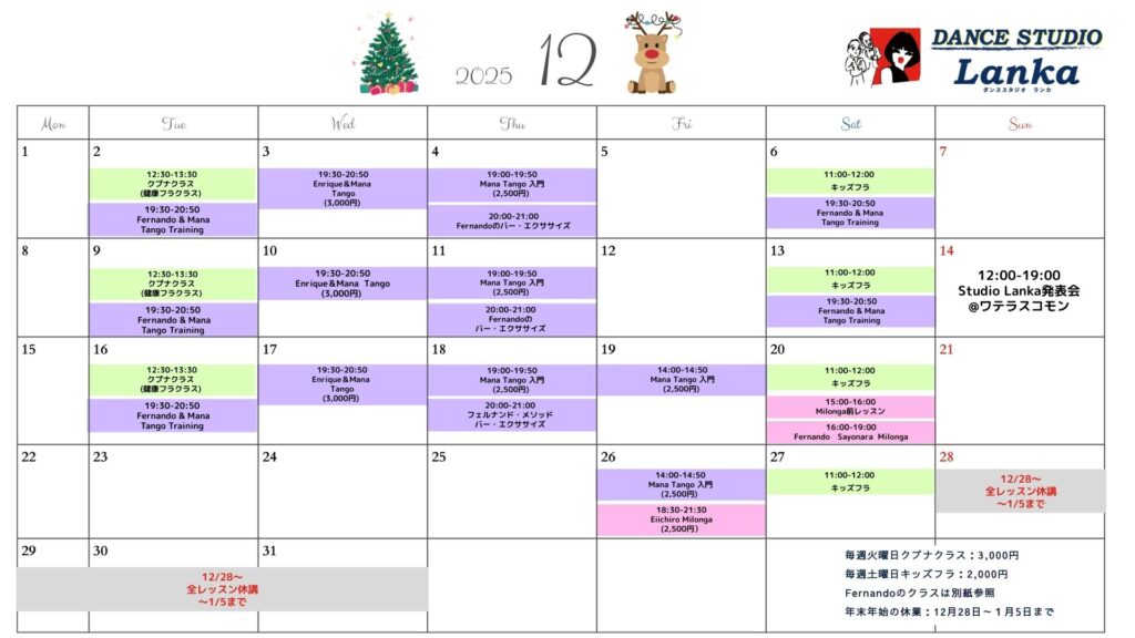 スタジオランカのレッスンスケジュールをカレンダーでご覧いただけます。